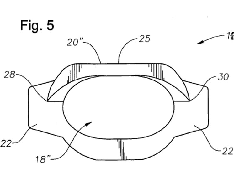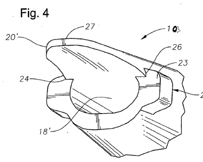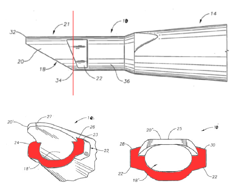 Der Fachmann entnehme der Beschreibung des Streitpatents, dass das Dach der ersten Ausführungsform die Öffnung ("opening 18") vollständig umgebe und dass es sich, ausgehend von seiner maximalen Länge bei 12 Uhr, verjünge, bis es bei 6 Uhr bündig mit der Öffnung sei ("flush with opening 18") (Abs. [0017]). Die Öffnungsebene könne also nicht durch das vordere Ende des Dachs gebildet sein (grüne Linie in Abbildung 3 oben), sondern müsse (ausser bei 6 Uhr) proximal hinter diesem vorderen Ende angeordnet sein, ansonsten würde die klare Aussage zum Verlauf des Dachs in der Beschreibung keinen Sinn ergeben.